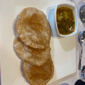 I was to meet my friend Parvity for brunch today, but I needed something to start the day, so I had some watermelon juice (which is served everywhere here) and a South Indian specialty poori bhaji which is bread and curry. No filter coffee here, but they at least have the French press coffee.